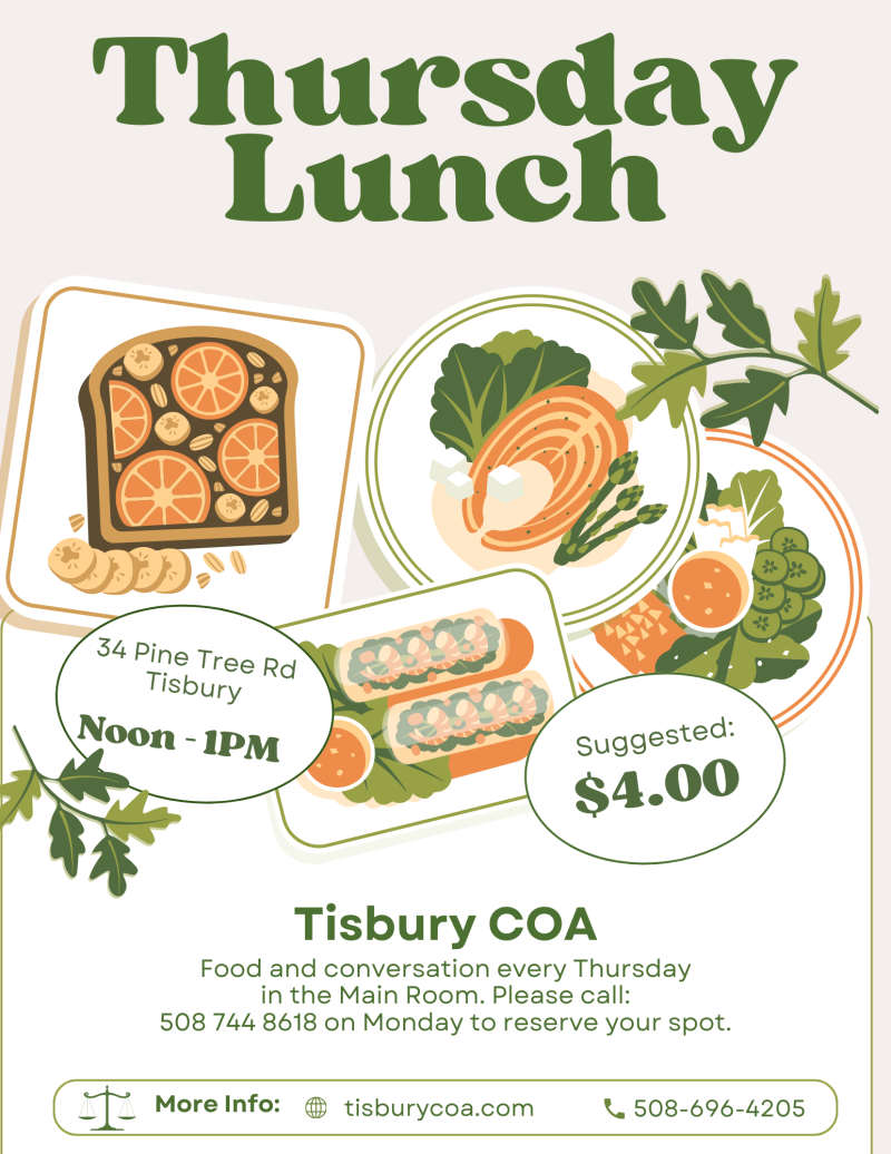 Thursday Lunch at noon. Visit: Senior Nutrition Programs | Elder Services of Cape Cod & the Islands for the menu. Don't forget to call 508 693 4393 ext 466 on Monday to reserve your spot.